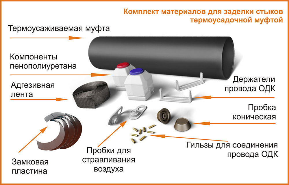 Комплекты для изоляции стыков труб ППУ ПЭ – набор компонентов, обеспечивающих надежную герметизацию и защиту от теплопотерь мест соединения, покрытых пенополиуретаном с оболочкой из ПЭ или ОЦ, элементов трубопровода.